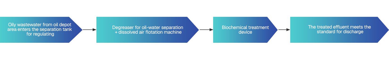 Oily wastewater in the tank source from the dock, the tank area,and oil distribution facilities. The oily wastewater from the dock primarily comprises ballast water from oil tankers, tank cleaning water, and top water of process; the oily wastewater from oil distribution facilities mainly includes wastewater produced during the operation of loading platforms, pump rooms, and associated pipelines; and the oily wastewater from the tank area constitutes the majority of the oily wastewater in the oil depot, which includes cut water from tank , tank cleaning water, equipment and ground flushing water, and contaminated rainwater.