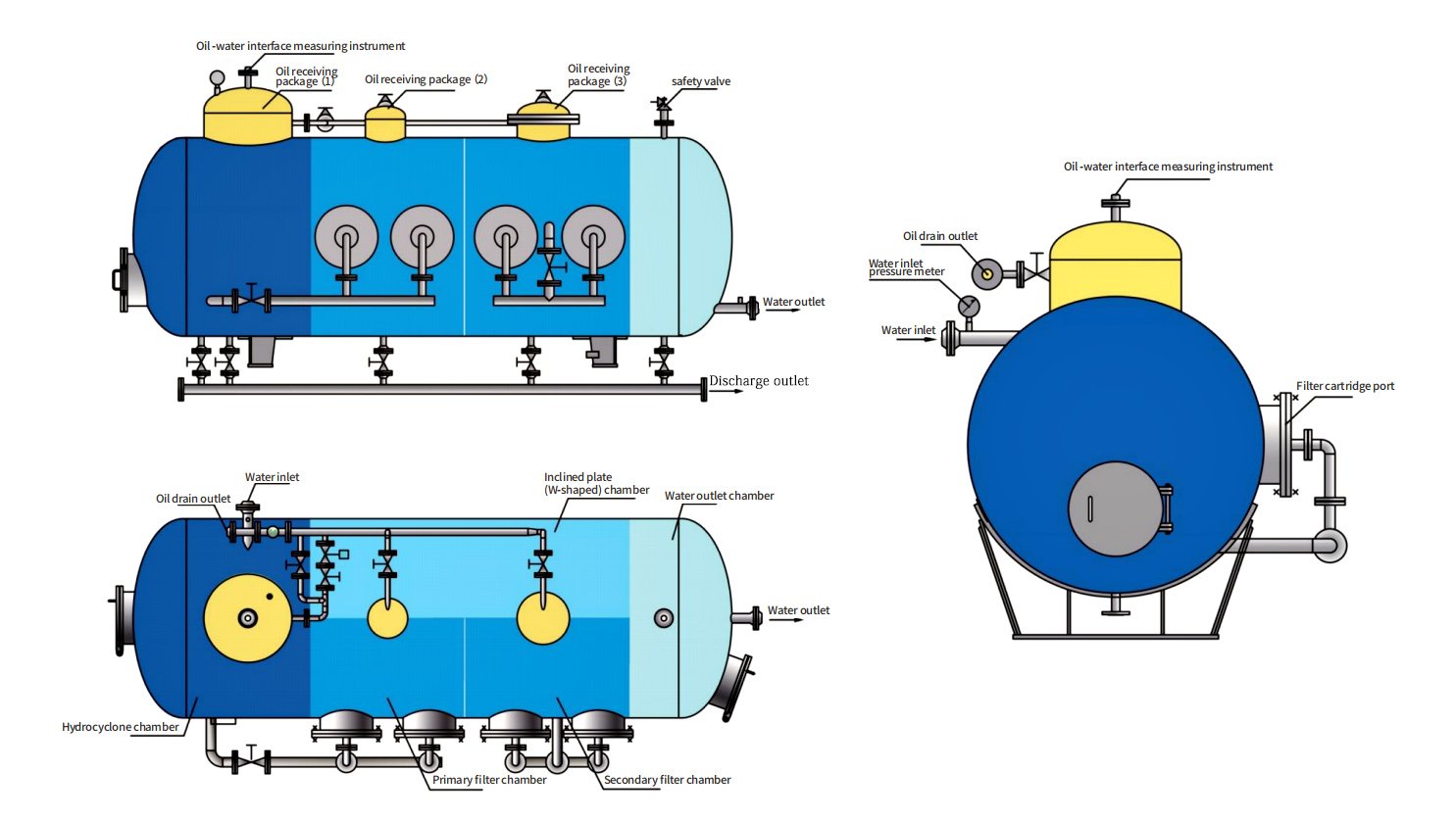 The first and second-level demulsification filter cartridges are used to demulsify, coalesce, and separate tiny oil droplets ranging from 0.1 to 10 microns;